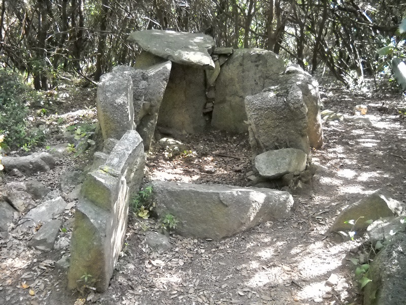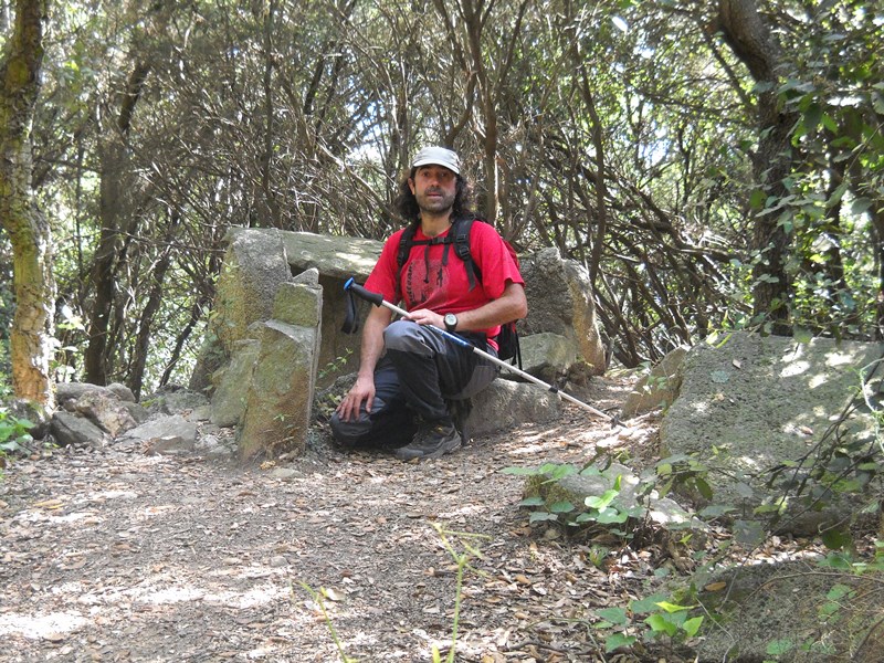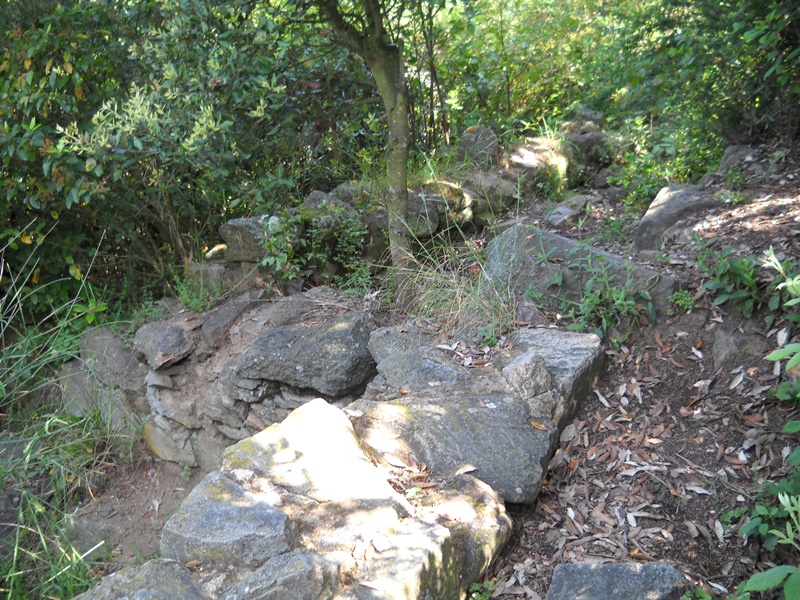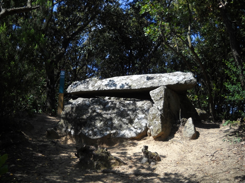 Del replà prenem la pista que puja a la nostra esquerra. Passem pel costat del dolmen de Can Gurri (pal indicador) i continuem fins arribar a una pista amb una característica torre eléctrica. Trobem de nou el GR-97-3 i el seguim ara en direcció sudoest (dreta). Seguim la pista i les marques de GR que abandonen la pista carenera per on anàvem per arribar al dolmen de Castellruf (indicador) pocs metres abans d’arribar al coll de Castellruf (414m). D’aquest coll surt al nord un corriol (pal) que puja força dret fins el cim del turó de Castellruf, on podrem visitar el poblat ibèric situat al seu cim.