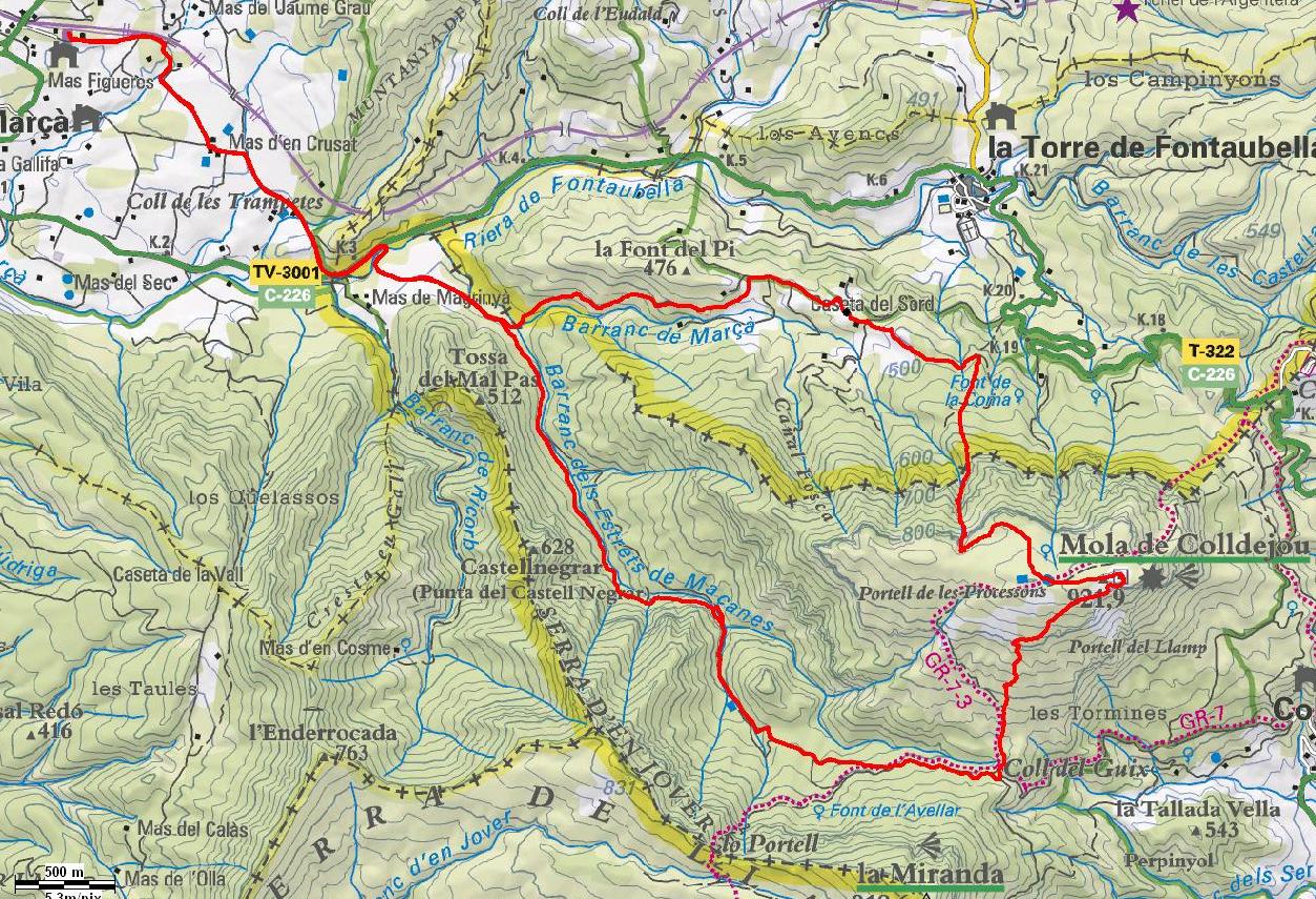 La ruta és circular. Pujarem a la Mola de Colldejou acostant-nos a la Torre de Fontaubella per anar a buscar la Canal del Mig, un corriol dreturer que s’enfila fins a la plataformo cimera de la muntanya. La tornada la farem passant pel coll del Mig per seguir el barranc dels Estrets de Maçanes de baixada.