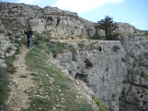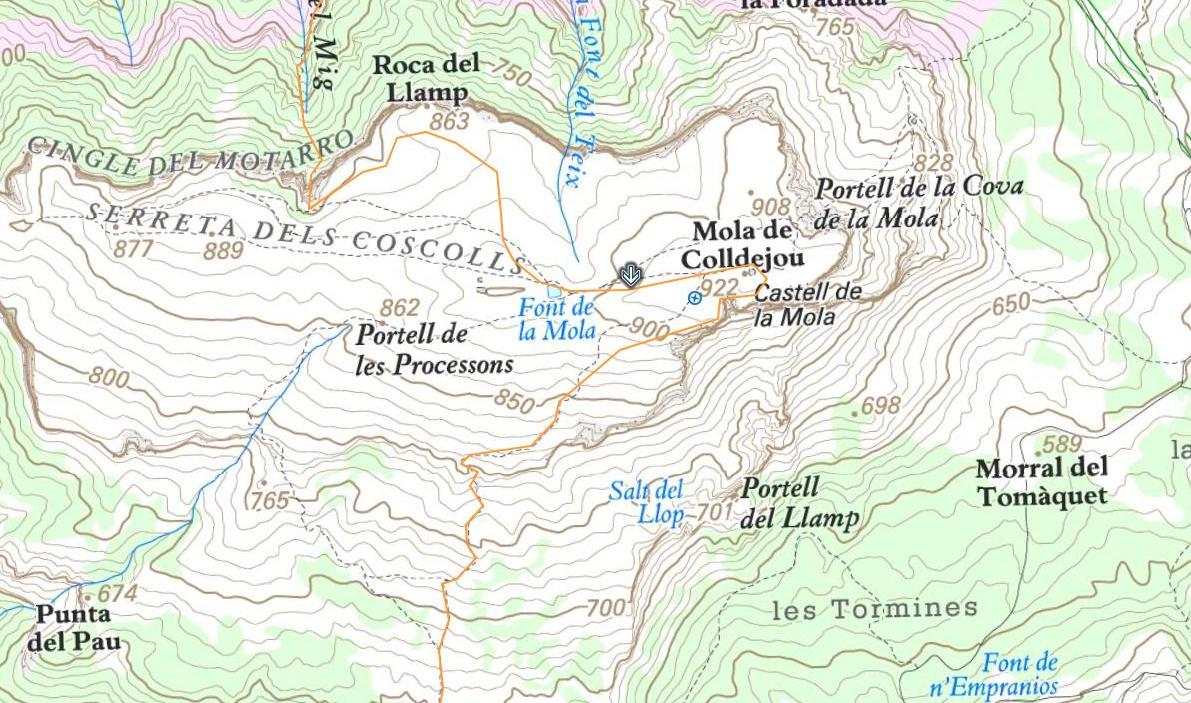 Aproximadament 800 m després (km 3,3 de la ruta), trobem una bifurcació. Hem de seguir pel camí de l’esquerra. El camí de la dreta serà el camí per on tornarem. La pista, va girant al nordest fins agafar direcció nord quan s’afegeix a una altra pista cimentada (km 4,9), que seguirem a la dreta (est) durant 800 m fins a trobar una cruïlla (alt. 472 m). Seguim recte durant aproximadament 700 m fins a trobar un corriol que surt a mà dreta, i que s’enfila, cada cop de forma més costeruda a través de la canal del Mig de la Mola de Colldejou.