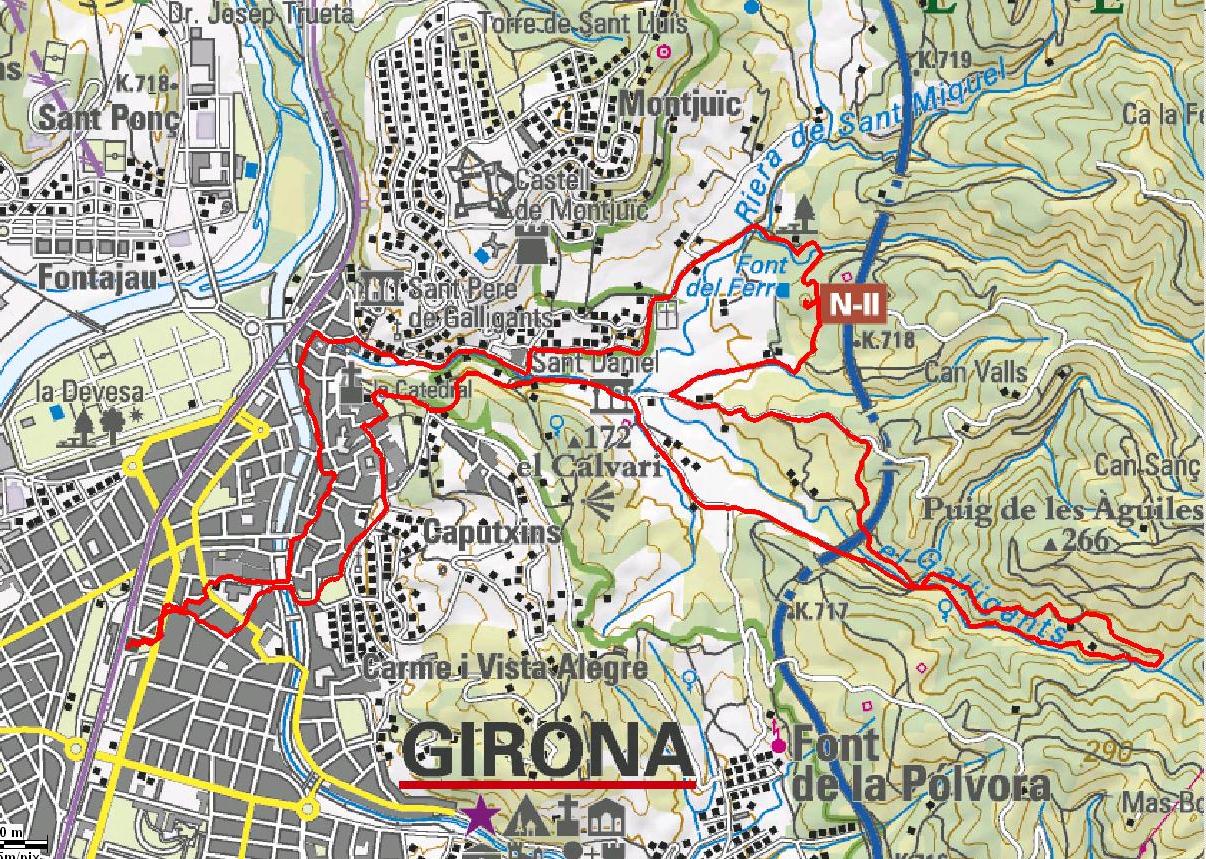 Al final de la pista trobem un pàrquing. Tombem a l´esquerra tot seguint el carrer Camí de la Font de Ferro. Poc després del cementiri tornem a girar a l’esquerra passant al costat del veïnat de Carme Auguet. Al final del carrer trobem el monestir de Sant Daniel, on agafarem el carrer de Sant Daniel que ens portarà fins a la ciutat de Girona, just on es troba el Museu Arqueològic de Catalunya, situat a l´antic monestir de Sant Pere de Galligants.
