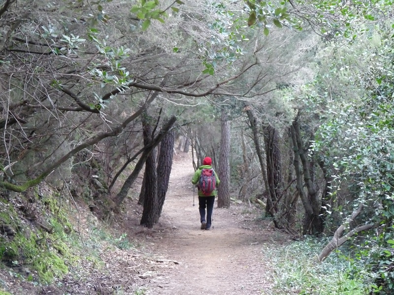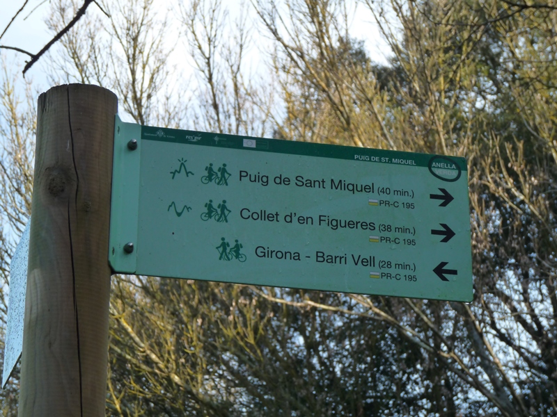 La pista a la dreta és el camí dels Àngels. El prenem i continuem i de nou en pujada el seguim durant 700 m fins que trobem un pla d´on surt un corriol (pal indicador) que porta al mirador situat al cim del Turó de Can Garcia (145m) des d´on tenim una excel·lent panoràmica sobre la vall de Sant Daniel.