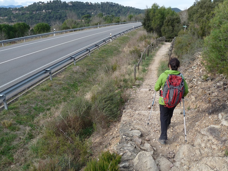 Seguim la pista fins a retrobar la Font del Lleó, però enlloc d’agafar el camí per on hem vingut anteriorment, prenem una pista a l’esquerra en direcció nord-oest que torna a pujar per passar poc després de nou sota el pont de la variant de la N-II. Passats 400m del pont trobem una pista i la seguim a l´esquerra durant 800 m més quan trobem una cruïlla pocs metres després de Can Tomàs.