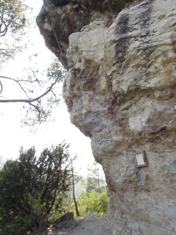 Cal parar atenció al punts verds donat que hi ha multitud de corriols i dreceres de pujada. El camí puja rost, de forma ràpida guanyem alçada fins a trobar una bifurcació important als 20 min (750 m de recorregut des de l´estació). En aquest punt som al nivell de la cinglera on es troba la VF. Si mirem a la dreta, una mica amunt, veurem l´escala de ferro per on baixarem. Nosaltres tombem a l´esquerra seguint sota el cingle, sense guanyar ni perdre alçada durant 4-5 minuts (230 m), quan trobem l´inici de la VF.