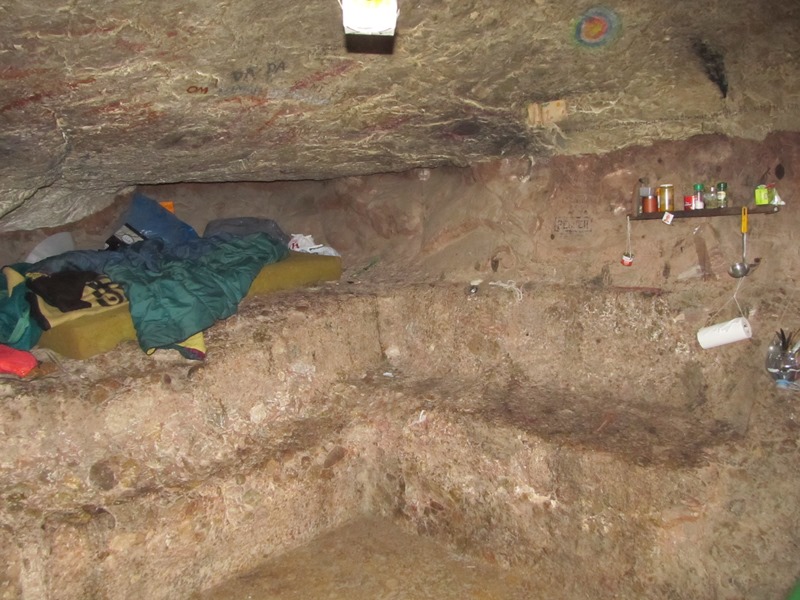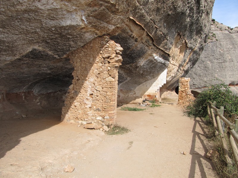 Desfem el camí fins la bifurcació anterior per ara continuar el camí de baixada en direcció NE (dreta) en baixada. Trobem de nou unes escales entre dues agulles i quan siguem a mitja baixada agafem un curiós trencall a la dreta que transcorre sota un gran balma, i per on per progressar fins i tot ens caldrà girar el cos una mica en algun punt. Som a l´antiga ermita de Sant Onofre que connectada amb l´antiga Ermita de Sant Joan a través d´unes antigues portalades i finestrals.