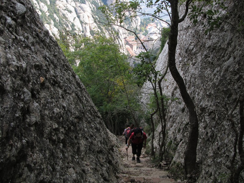 Sortim de l´estació del Cremallera de Montserrat cap a l´oest (dr.) en direcció al supermercat i enfilem escales amunt que ens porten a través del GR-4 i GR-172 fins a la Plaça de Santa Anna a través del Pas dels Francesos, estret pas esglaonat que dóna accés a la Plaça de Santa Anna.