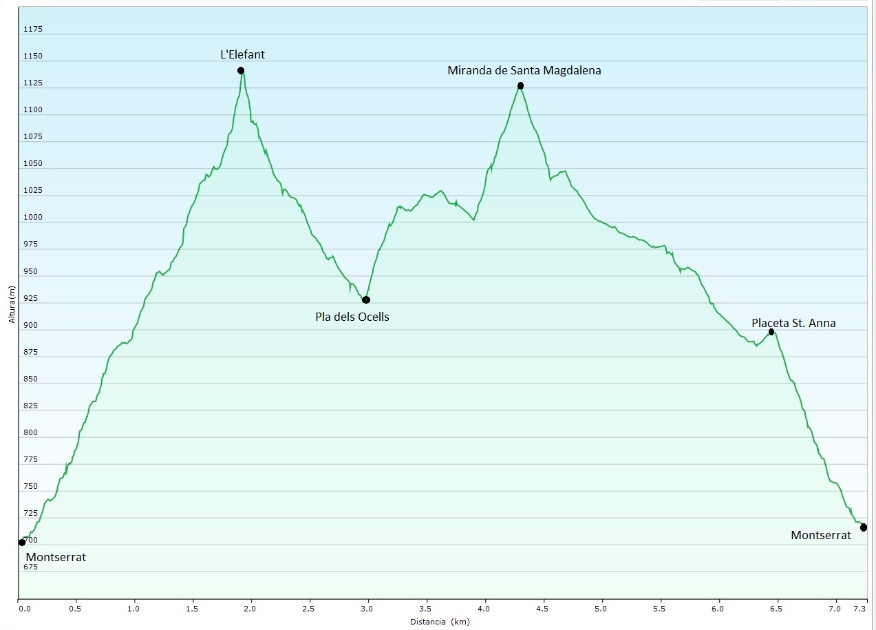 Interessant excursió per Montserrat que sense allunyar-nos mai massa del Monestir us portarà a pujar dues agulles montserratines incloses dins de la llista dels 100 Cims de la FEEC, l’Elefant i la Miranda de Santa Magdalena. Des d’aquests cims tindrem la veritable sensació de ser al capdamunt d’una agulla montserratina sense haver d’escalar-ne cap. Només l’Elefant presenta una petita grimpada final que a les persones no acostumades pot presentar una petita dificultat.