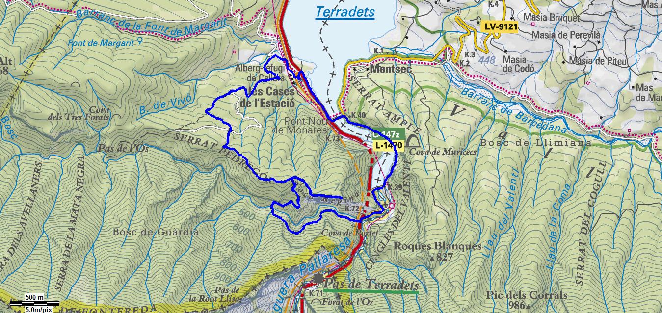 - Ruta: Estació de Cellers – Serrat Pedregós – Roca Regina – Barranc del Bosc – Pantà de Terradets – Cova Muricecs – Estació de Cellers