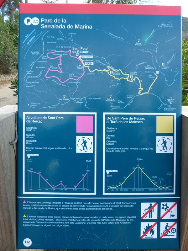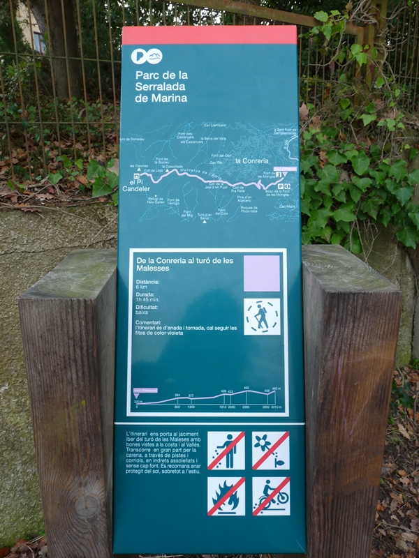 A tocar de l´ermita hi ha un plafó informatiu de dos senders locals (SL). Nosaltres seguirem el SL C-149 que ens conduirà fins al cim mateix del Turó de les Maleses on es troba un poblat ibèric. Només trobarem indicadors verticals marcant el sender.