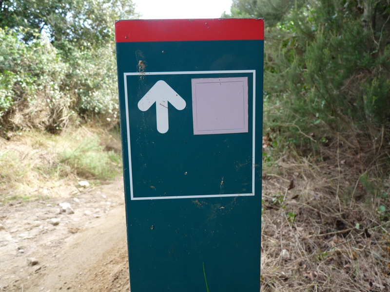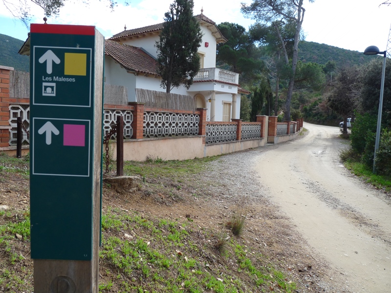 Trobem les marques d´abalisament blanques i vermelles del GR-92 que s’incorporen al camí des de la dreta. Poc després veiem un plafó explicatiu del sender SL C-150 amb un petit mapa i perfil de la ruta amb distàncies i desnivells entre aquest punt i el cim del Turó de les Maleses.