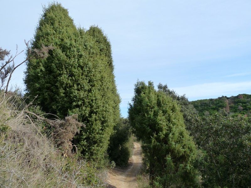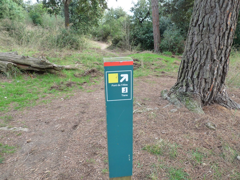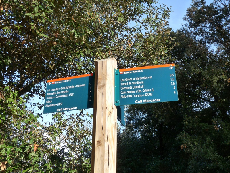 Uns metres més avall trobem una cruïlla de camins (pal indicador). A la nostra esquerra un parell de pistes menen cap a Santa Maria de Martorelles. Nosaltres hem d´anar vers la dreta en pujada seguint les marques del GR-97.3 entre vinyes de la DO Alella i un bosc mixt d´alzines i pins amb llentiscle fins arribar al coll Mercader.