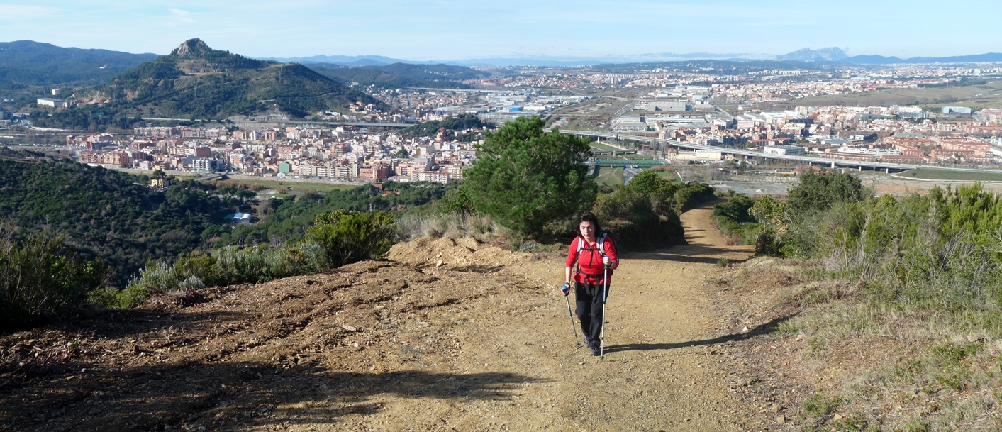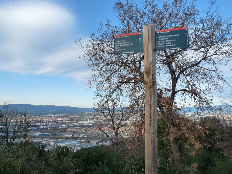 Desfem les passes fins l´anterior cruïlla per tombar ara a la dreta. Deixem enrere el Parc de la Serralada de Marina per entrar al Parc de la Serralada Litoral. Anem per una pista entre un bosc d´alzines i amb bones vistes sobre el Vallès i els Pirineus. A la primera cruïlla girem a l´esquerra per la pista que baixa en direcció nord seguint sempre la pista principal. Després d´una curta però pronunciada rampa, arribem a una cruïlla on trobem les marques del sender de gran recorregut GR-97.3.