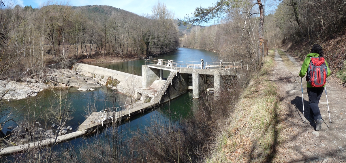 Durant prop d’un quilòmetre caminarem a tocar del riu i les vies del tren que tindrem a la nostra dreta. A la nostra dreta veiem la resclosa de La Corba, una construcció d’aprofitament hidràulic construïda per SAPHIL entre els anys 1932-1934. El canal d’aprofitament per a la producció elèctrica té la característica de ser subterrani durant bona part del seu recorregut.