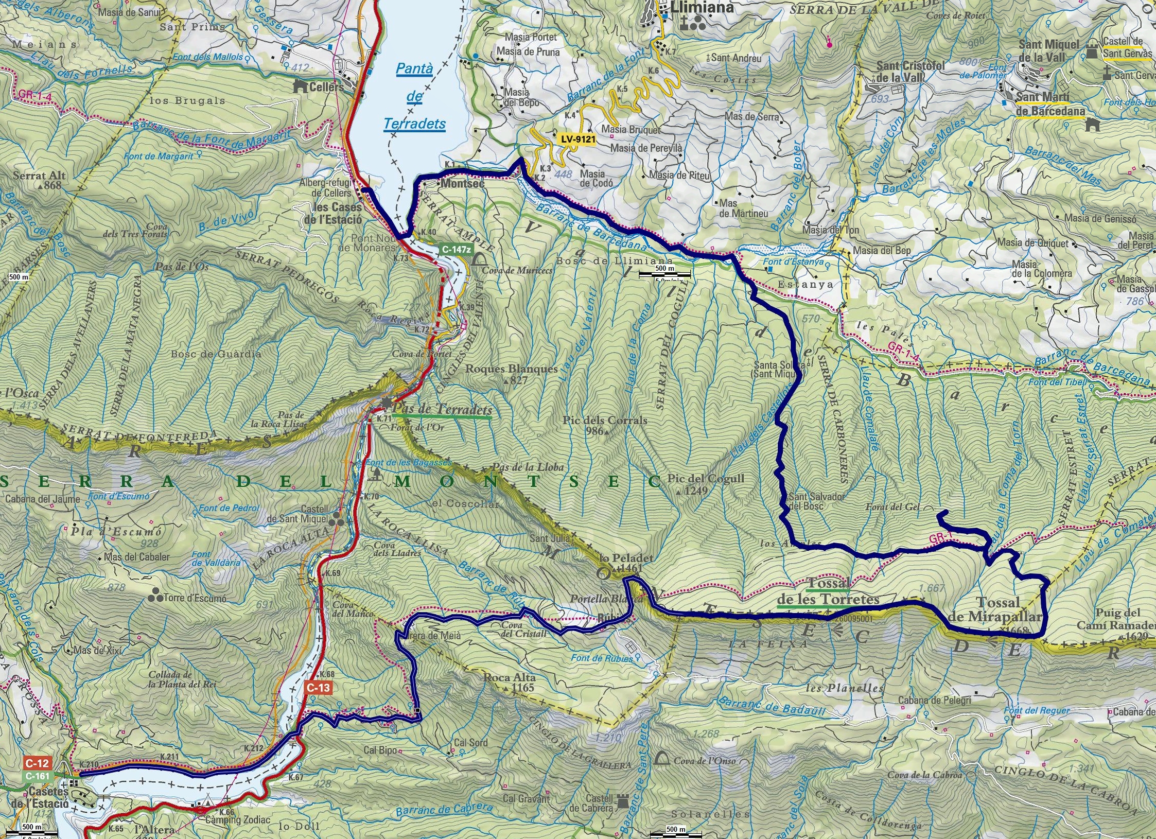 - Ruta: Estació d’Àger – La Passarel·la – barranc de Rúbies – Pedrera de Meià – Rúbies – Portella Blanca – Tossal de les Torretes – coll de Mirapallars – Tossal de Mirapallars – Grau Ample – Forat de Gel – Cent Corbes – Sant Salvador del Bosc – Barranc de Barcedana – Pont de Barcedana – Pantà de Terradets – Estació de Cellers