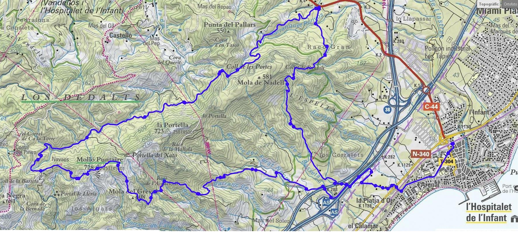 - RUTA: Estació de l´Hospitalet de l’Infant – – benzinera – àrea de Servei AP-7 – Font de l’Aigualcoll – barranc del Forat Negre – Molló Puntaire – Font de Navaes – Coll de la Basseta – La Barrancada – Coll de les Portes – carretera C-44 (prop de Masriudoms) – Collet de Puntalt – l’Hospitalet