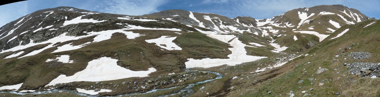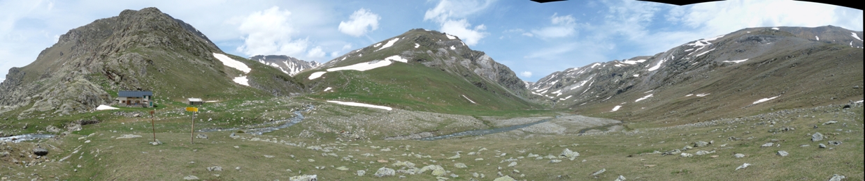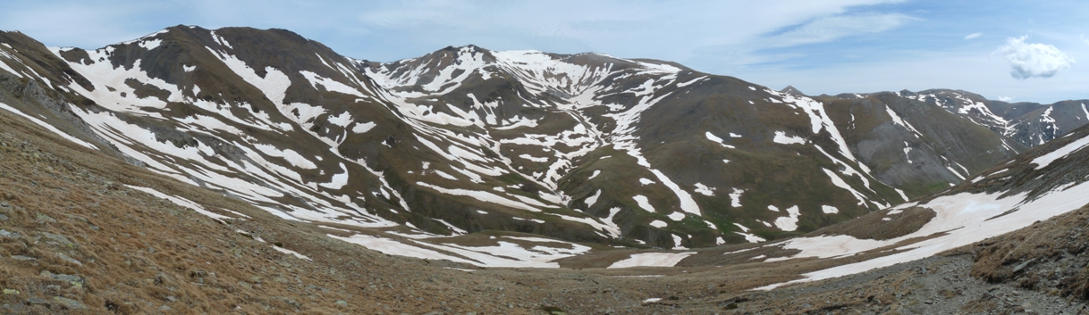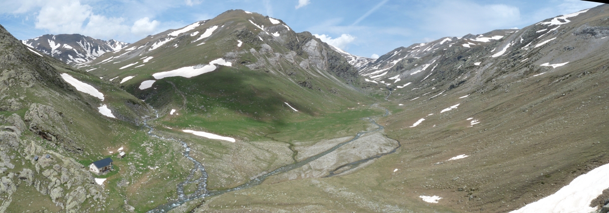 Planegem pel vessant sud del pic de l’Àliga fins a l’Alberg de Niu d’Àliga amb bones vistes del cim de l’Ortigar i el Puigmal a la nostra esquerra i amb el pic de Finestrelles al fons.