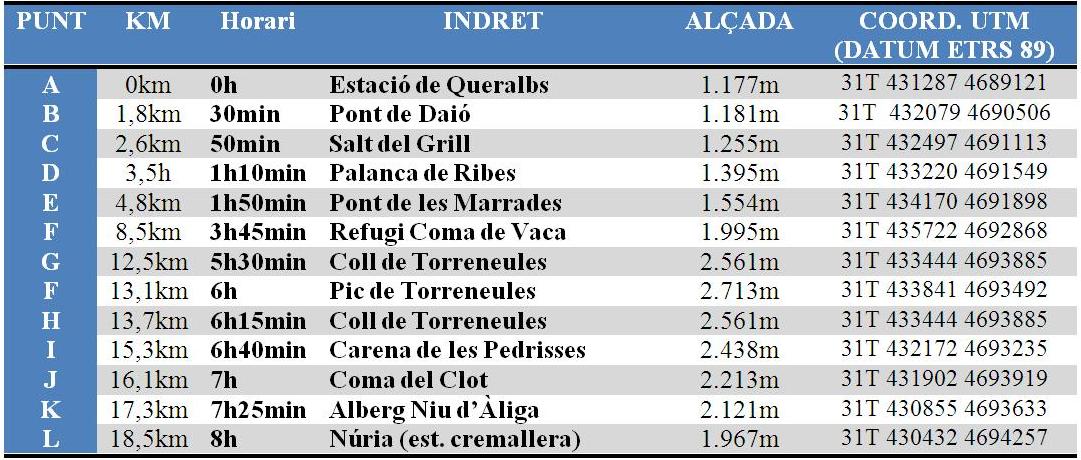 - Ruta: Estació de Queralbs – Pont de Daió – Gorgues del Freser – les Marrades – Refugi de Coma de Vaca – coll de Torreneules – Pic de Torreneules – Jaça del Clot – Alberg Niu de l’Àliga – Santuari de Núria
