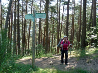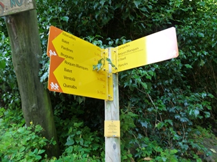 Punt on hem d’estar atents a deixar la pista en un revolt a l’esquerra en pujada. Quan hi vam passar no hi havia cap indicador. Hem d’agafar el corriol que surt a la dreta (oest) entre un bonic bosc de roures i avellaners i que va a tocar d’un filferro a la nostra dreta. Sabrem que anem pel bon camí per les marques grogues d’Itinerànnia que anirem veient.