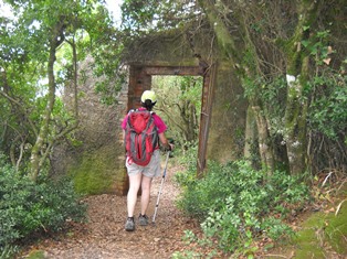 El camí segueix cap al sud-oest per un corriol emboscat i ombrívol. Després de 4-5min (380m) trobem a la dreta el trencall que puja a l’Elefant (direcció a Sant Salvador que veiem escrit sobre una pedra). Passem sota una curiosa portalada mig engolida per la vegetació que abans aïllava l’ermita de Sant Benet.