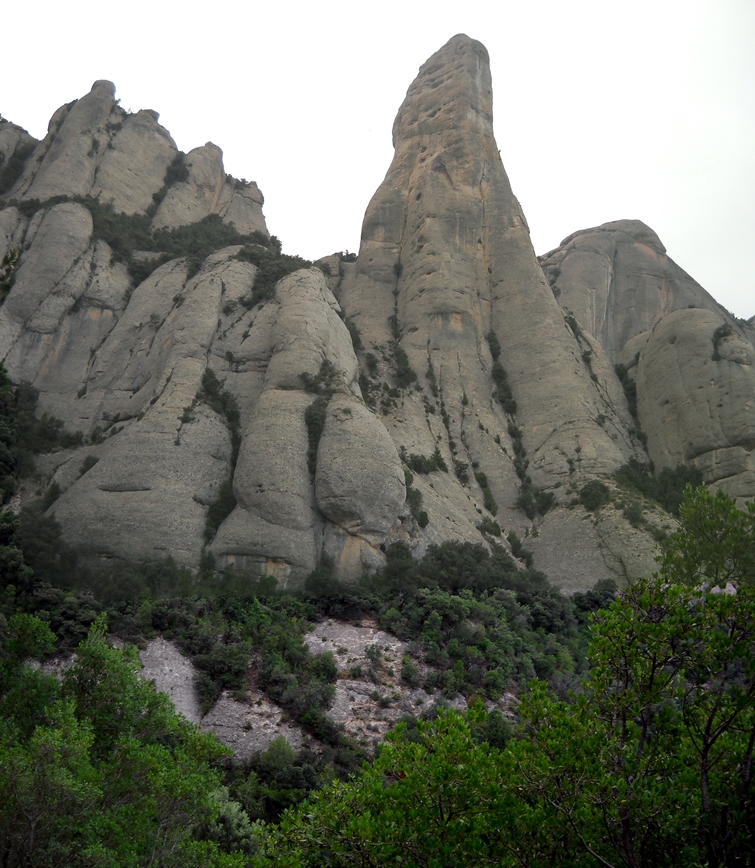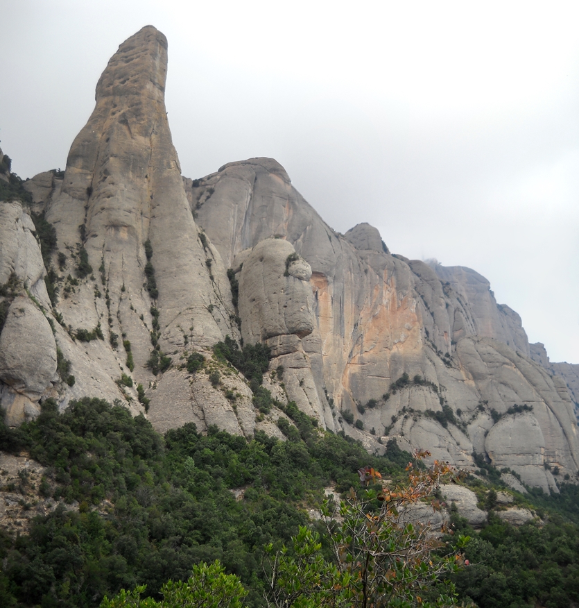 Som al tram més interessant de la caminada. El camí va entre un frondós alzinar amb boix, galzeran i roures que fa baixar uns graus la temperatura que teníem en altres zones de la pujada. El sender transcorre pel vessant nord del massís sota les imponents parets de Sant Jeroni i dels Diables. Mentre caminem podem alçar el cap i mirar de buscar els escaladors que pugen el Cavall Bernat per la via Punsola-Reniu (230m 6c) o per la Gran Il·lusió, 235m 7a+ (6a+ oblig.), dues vies clàssiques d’escalada d’aquesta imponent agulla montserratina.