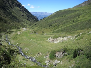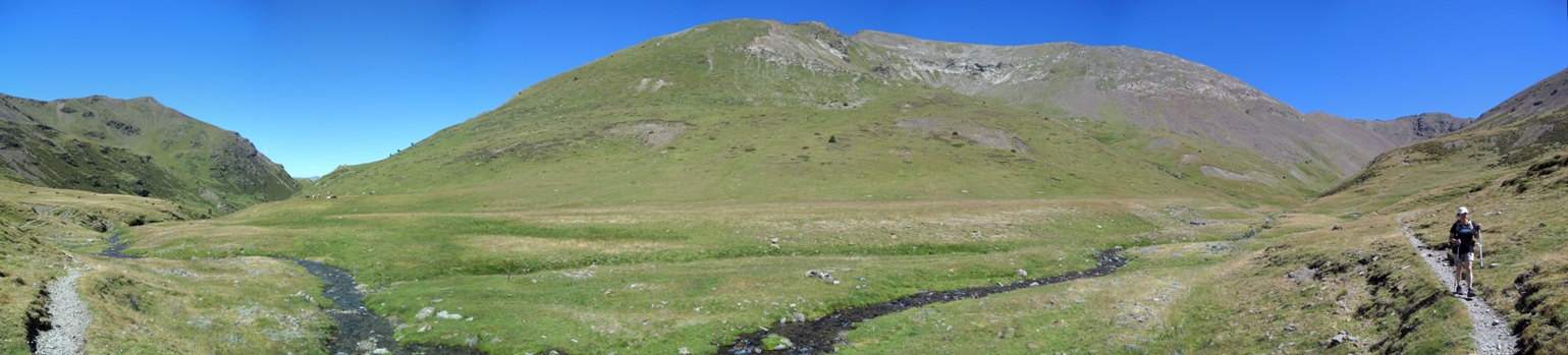 Pla de pastures on sovint hi trobarem bestiar, probablement boví. Veiem l’Orri de Dalt a l’altre marge del riu. El camí baixa amb vistes cap al cim del Carlit i del Collroig al fons. A la banda de solell grans prats de bàlec omplen els vessants que baixen del pic de Cambradase. Per contra, al vessant obac el neret és el que cobreix de verd els pendents de la Serra dels Clots.
