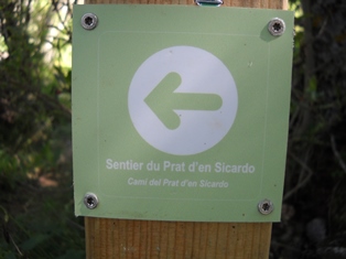 Esplanada amb un gran tancat de fusta a la nostra esquerra envoltada de pins negres. A la dreta surt un camí que va al Prat d’En Sicardó i que no seguirem. Prosseguim recte i als pocs metres trobem a mà dreta una gran fita de pedres i una placa rodona de l’ “Arret 7” del sender senyalitzat ‘Camí del Prat d’En Sicardó’, un sender d’interpretació creat per la Reserva Natural d’Eina.