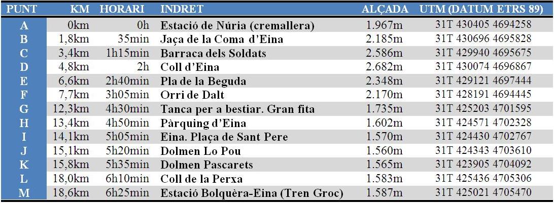 - Ruta: Núria (Cremallera) – Jaça d’Eina – Barraca dels Soldats – Jaça d’En Raula – Coll d’Eina – Pla de la Beguda – Eina – Dolmen Lou Pou – Dolmen Pascarets – coll de la Perxa – Estació Bolquèra-Eina (Tren Groc)
