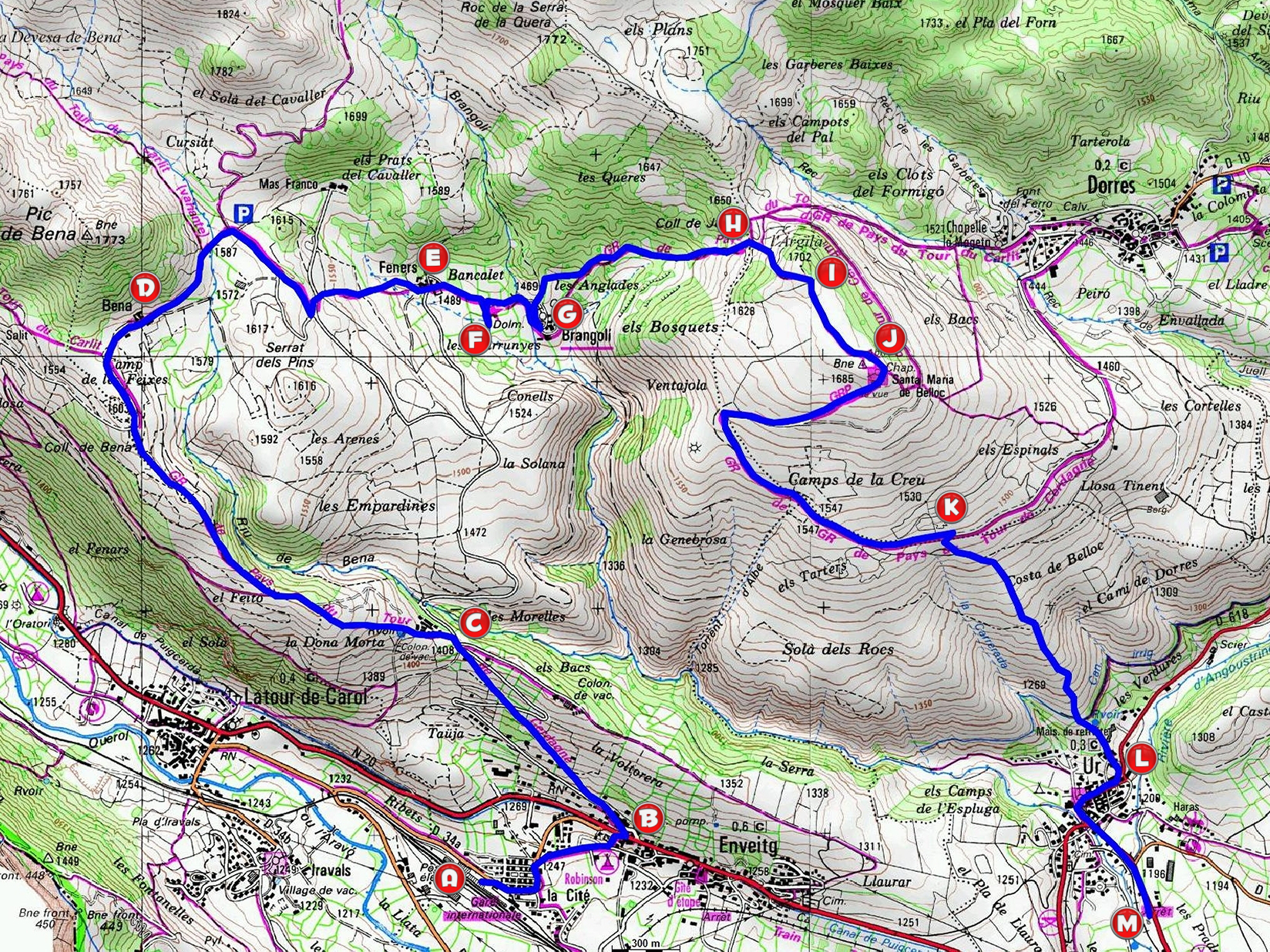 Gairebé durant tota l’estona seguirem un sender de GRP (Grande Randonnée du Pays). Aquests senders abalisats es caracteritzen per recórrer distàncies mitjanes, sovint de menys de 50km, que descobreixen regions generalment en rutes circulars. Són GRP el Tour du Carlit, el Tour du Capcir o el que nosaltres seguirem durant una bona estona, el Tour de la Cerdanya.