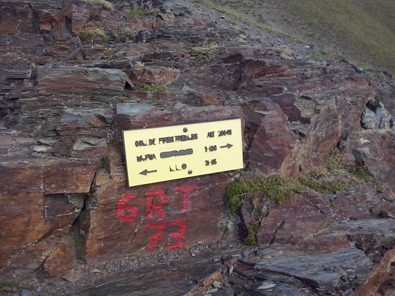 Poc després del pont trobem ja les marques del GRT-73, sender de gran recorregut fronterer que ens acompanyarà fins el coll de Finestrelles. El sender només té 4,3km i connecta Núria amb el coll de Finestrelles, punt que connecta el Ripollès i la comarca de l´Alta Cerdanya a la Catalunya Nord.