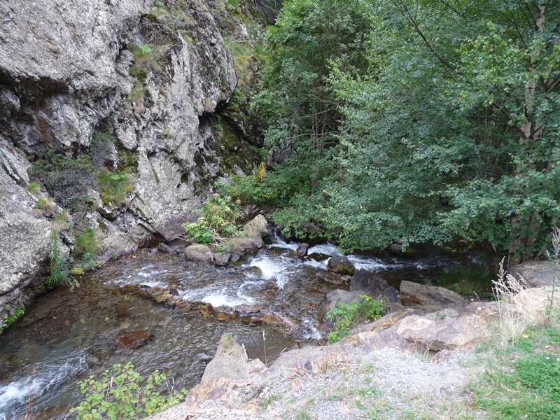 Bifurcació de camins on trobem una gran fita de pedres i un petit cartell indicador groc de senders francesos. Aquí abandonem el Camí de Núria que va cap a la Font del Segre i Er (It. 83 Senderisme en tren) per continuar a la dreta. El corriol baixa zigzaguejant pels vessants que baixen del Puigmal del Segre (sud) i del pic de Finestrelles (nord) vall avall.