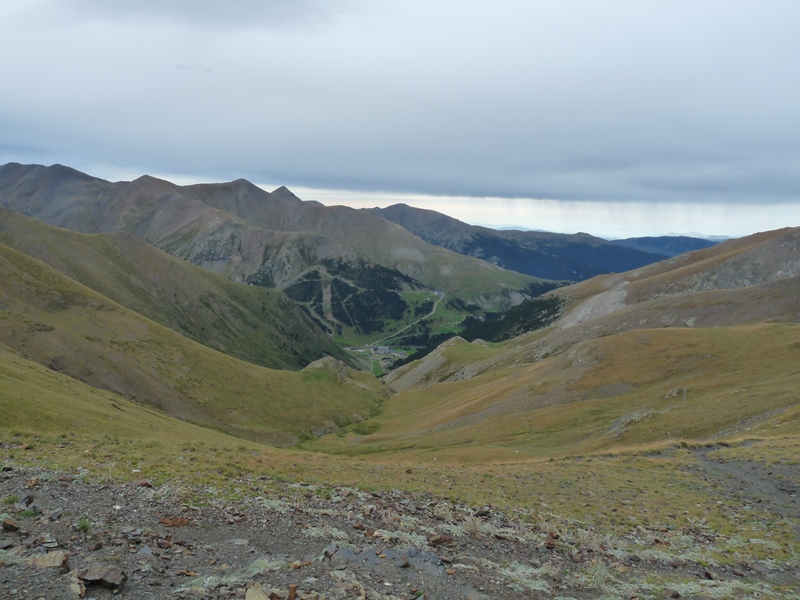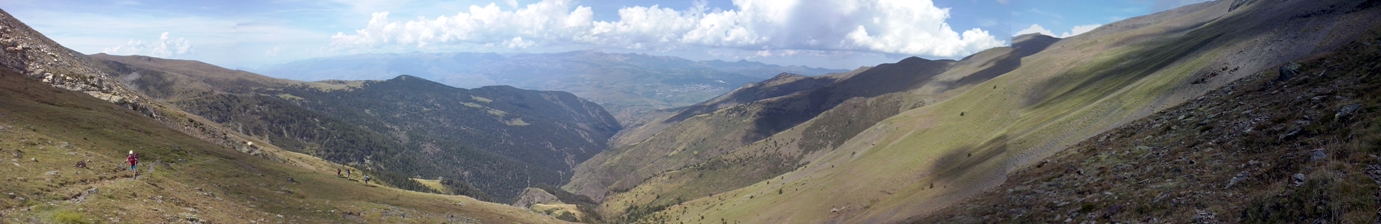 Enfilem la baixada cap al nord en direcció a Llo, a 3h15min de camí segons ens marca un indicador de camins francès que trobem clavat en una roca. El corriol baixa flanquejant el vessant nord del Puigmal del Segre amb enormes vistes davant nostre de la vall del riu Freser, emboscada al vessant oest i sense arbres a llevant. Poc després de creuar el Rec dels Collets, trobem una cruïlla de camins.