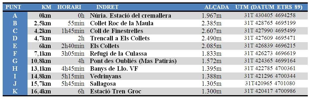 - Ruta: Estació de Núria – Roc de la Maula – Coll de Finestrelles – Els Collets – Refugi de La Culassa – trencall a Mas Patiràs – Banys de Llo – Vedrinyans – Sallagosa
