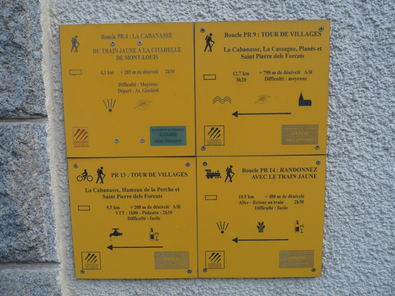 A l’exterior de la mateixa estació veurem plafons informatius de diferents senders i un mapa de rutes en BTT. Fins a Fontpedrosa seguirem íntegrament el sender PR14 Randonnez avec le Train Jaune. Hem d’estar atents a no confondre’l amb el PR12 Le Train Jaune, un altre sender amb nom semblant al que seguirem però que es dirigeix cap a Sautó.