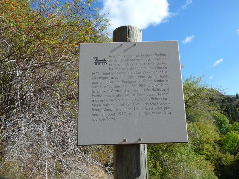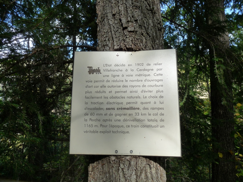 Després de 50m de passar sota les vies hem d’estar atents d’agafar el trencall (indicador) a l’esquerra i seguir per un corriol estret que passa sobre l’estació de Planès. El camí segueix sobre el riu Têt el sender ‘Les Arbres du Haut-Conflent’ entre un variat bosc per on anirem trobant uns pràctics plafons que ens donaran a conèixer espècies d’arbres que anirem trobant pel recorregut: moixeres, pi roig, faig, cedre d’olor…