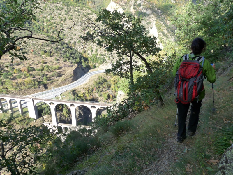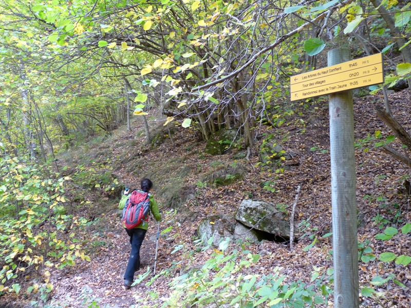 Retrobem el sender PR12 Train Jaune, camí que s’uneix per l’esquerra després de passar sota el pont Gisclard. Seguim el PR5 ‘Les Arbres du Haut-Conflent’ per un bosc variat de pi roig, fajos i fins i tot d’algun cedre fins a una cruïlla on abandonem el sender ‘Les Arbres du Haut-Conflent’ (pal indicador).