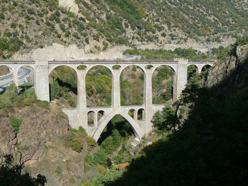 Superem la part més complicat de l’esperó rocós que engorja el riu més avall per un túnel excavat a la roca. Sota nostre podem veure el pont Séjourné, també anomenat pont de Fontpedrosa, acabat l’any 1908 ideat per Paul Séjourné. Té 236m de llarg i està format per dos pisos. El superior està format per uns grans arcs de volta, mentre que l’inferior, directament sobre el riu, acaba en arc ogival. El viaducte salva tant les gorges de la Têt com la carretera N-116.