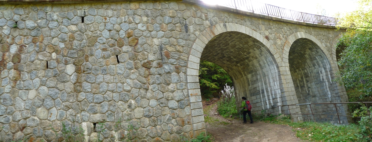 Passem sota el viaducte del Jardó, un bonic pont amb arcs de volta situat al quilòmetre 26,593 de la línia del Tren Groc.