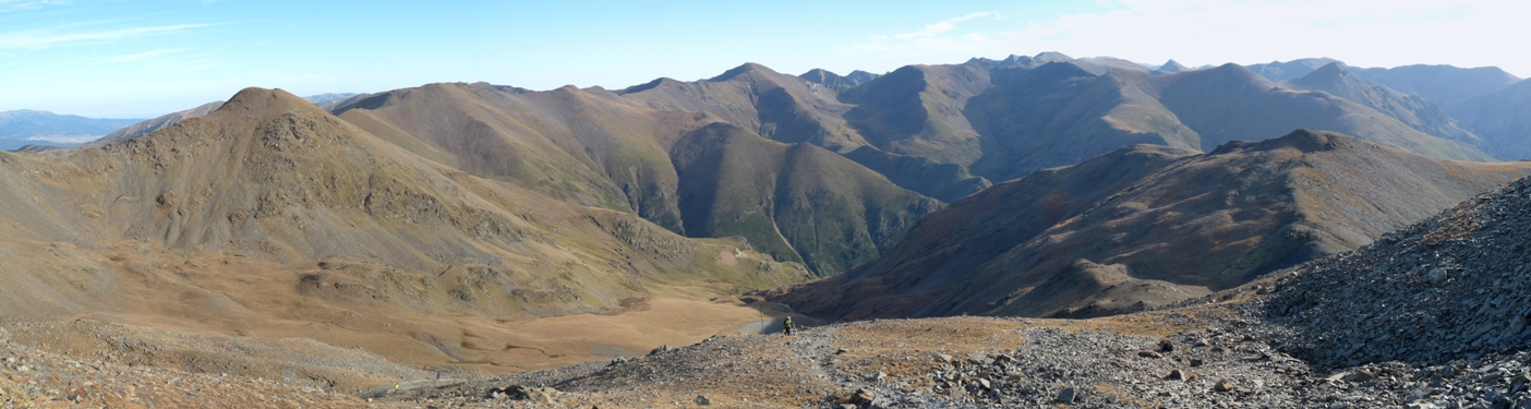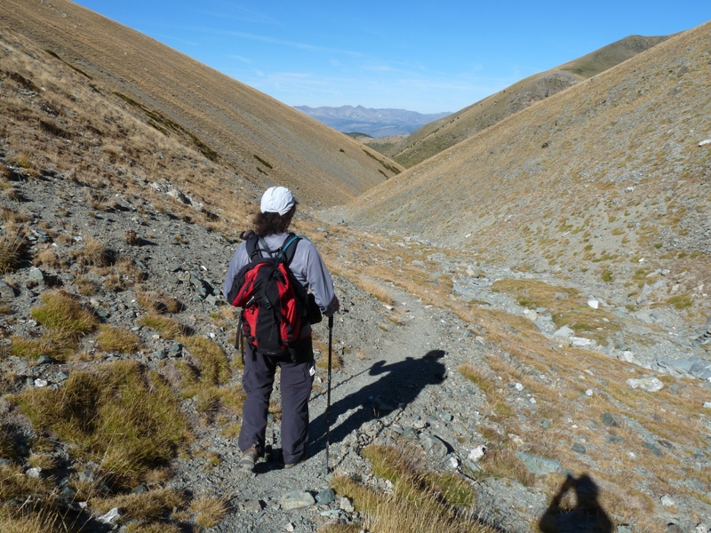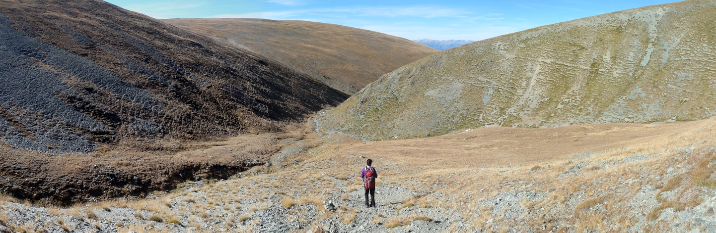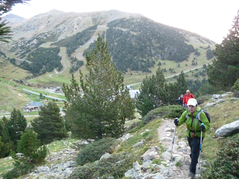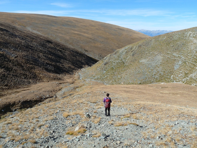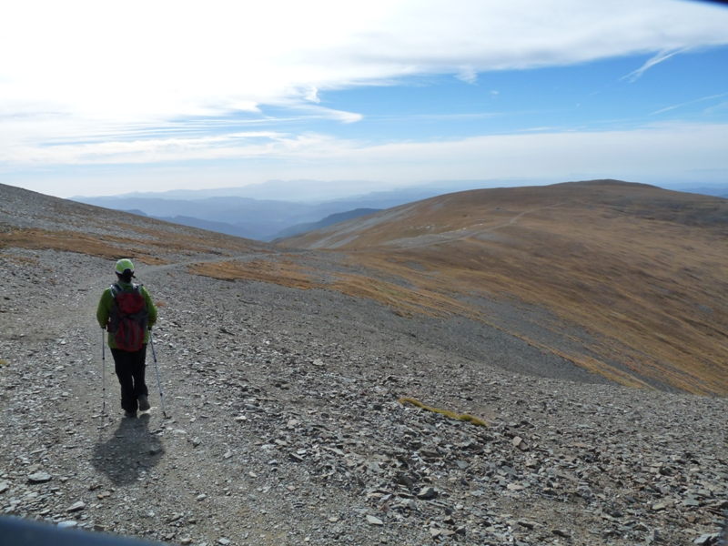 Deixem el Puigmal i emprenem la baixada en direcció sud-oest per un corriol ben fressat que baixa fort pel vessant de ponent. Als 2.840m trobem un trencall a la dreta. Continuem recte seguint el camí amb els senyals del SL que més endavant baixa pel vessant francès fins arribar a una esplanada.
