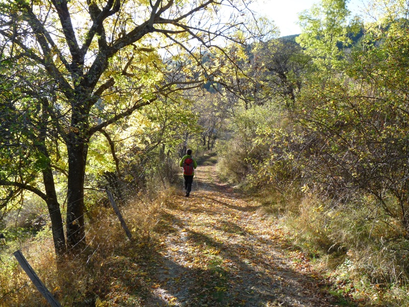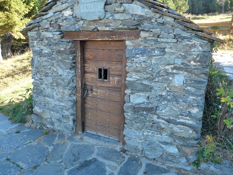 Caminem sempre pel fons del torrent, ara pel marge dret del torrent i seguint les fites de pedra i algunes fletxes blanques per un corriol que segueix sent no gaire trepitjat però que no té pèrdua. Hem de creuar dues pistes i seguir ara pel marge esquerre del torrent fins a trobar a mà esquerra l’únic edifici que trobarem fins a Sant Bernabeu.