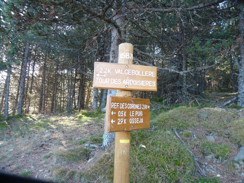 Cruïlla senyalitzada amb un indicador de fusta amb l’alçada a la que ens trobem (1587m) indicada al capdamunt. D’aquí surt vers al sud un camí abalisat que duu en 2,9km fins al refugi de les Corones, petit refugi lliure situat a 1.860m accessible per pista forestal.