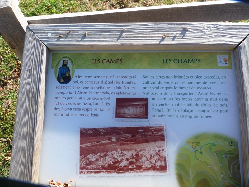 Baixem pel carrer Rue de l’Église avall. Abans d’entrar al poble, creuem el riu a l’esquerra, on trobem un gran plafó informatiu del Camí de Sant Bernabeu, sender circular amb sortida i arribada a Vallcebollera i que hem seguit de baixada.