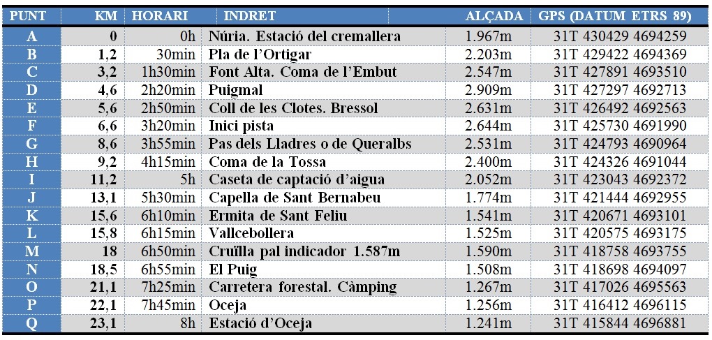 - Ruta: Estació de Núria –Pla de l’Ortigar – torrent de la Coma de l’Embut – Puigmal (100 cims) – Coll de les Clotes – Tossa del Pas dels Lladres (pel costat) – Pas dels Lladres o de Queralbs – Puig de Dòrria (100 Cims) – Torrent de la Tossa – Sant Bernabeu – Vallcebollera – El Puig – Oceja.