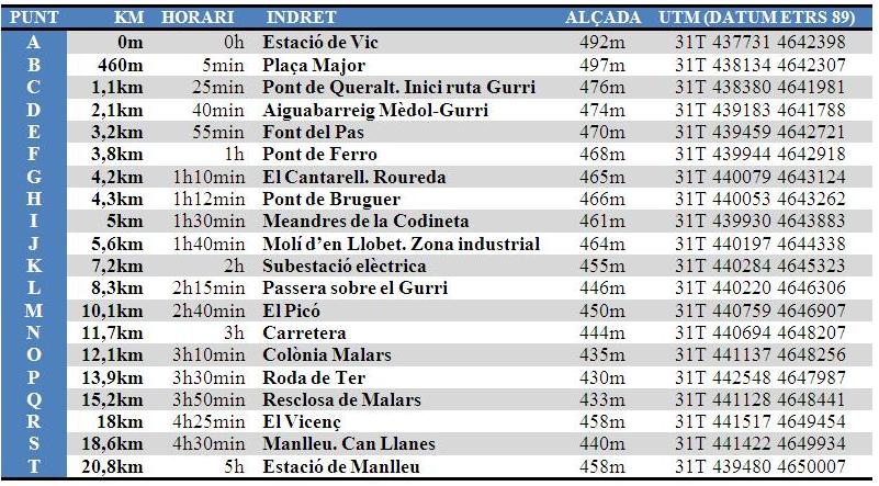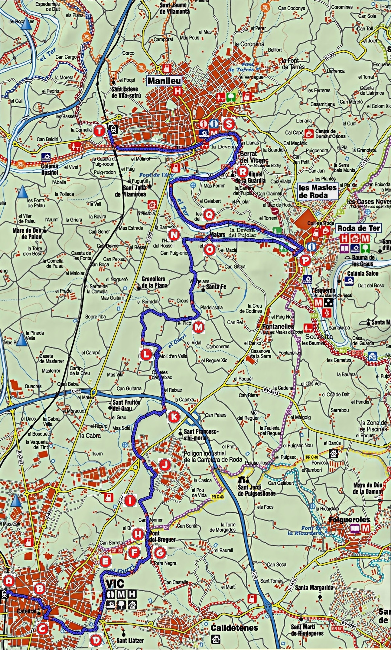 - Ruta: estació de Vic– Plaça Major – Temple Romà – Pont de Queralt – Les Adoberies – Parc de Xavier Roca i Viñas – Font del Pas – Pont de Ferro – Pont d’en Bruguer – Font Cantarell – El Bruguer – Molí d’en Llobet – Subestació elèctrica de Vic – el Reixac – Passera del Gurri – Terrer de la Teuleria – El Picó – Colònia Malars – Roda de Ter – Resclosa de Malars – El Vicenç – Manlleu –Estació de Manlleud