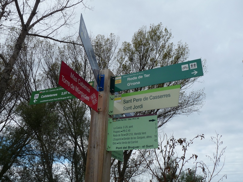 A tocar del pont veiem un plafó informatiu del pont i un pal indicador amb múltiples itineraris. I és que som a una important cruïlla de camins. Aquí ens creuem amb el PR C-40 de Vic a Sant Pere de Casserres. També passa per aquí el tram entre Folgueroles i Vic del Camí de Sant Jaume, el GR-151 Camins del bisbe i Abat Oliva i finalment l’Anella Verda, camí que venim seguint des de Vic i que abandonem en aquest punt.