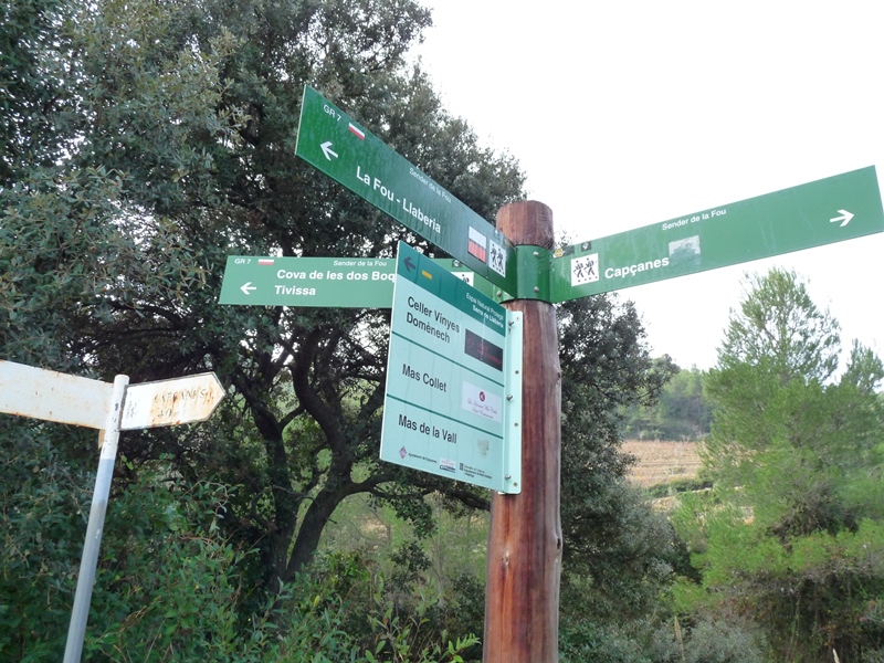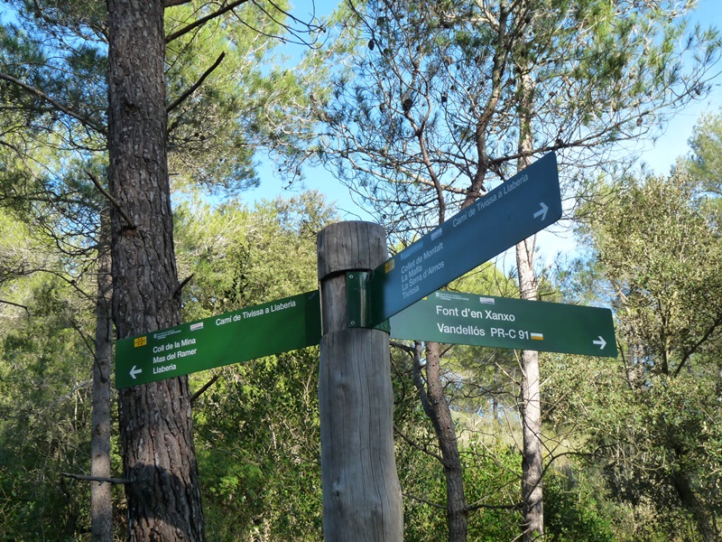 Trencall amb pals indicadors on trobem el sender GR-7 que ve de la Fou i de Llaberia. Deixem finalment a l’esquerra la pista cimentada que es dirigeix a l’hotel Mas Collet i seguim ara per pista de terra a la dreta. Aviat la pista esdevé un corriol que puja amb ganes entre un bosc amb pins, alzines, marfull i alguns teixos a tocar del sender.