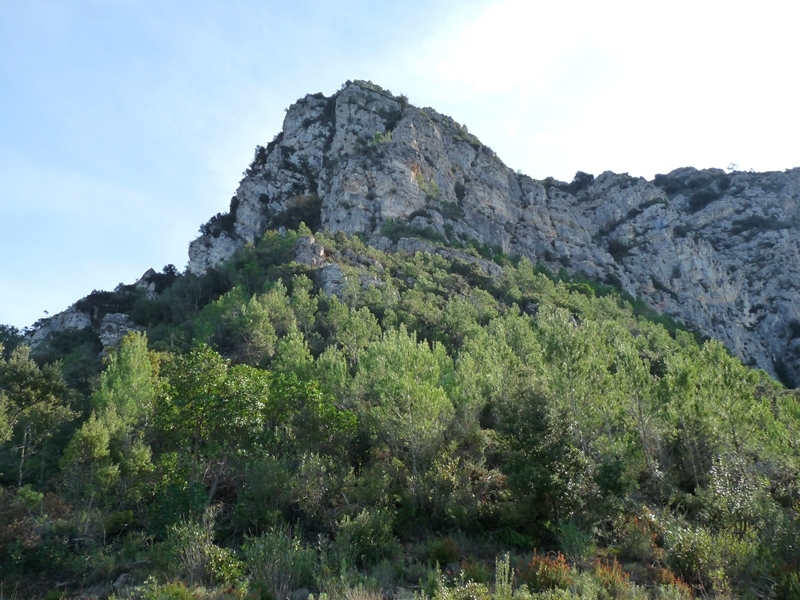 Assolim un petit coll on deixem les dificultats enrere. Des d’aquí agafem el camí a l’esquerra (nord) entre garric que va a buscar el vessant nord del cim del Montalt Nord per a pujar-lo, donat que pel seu costat sud un mur de roca el fa només accessible a escaladors.