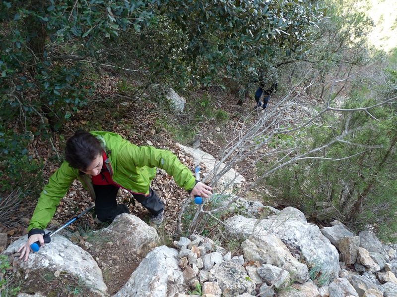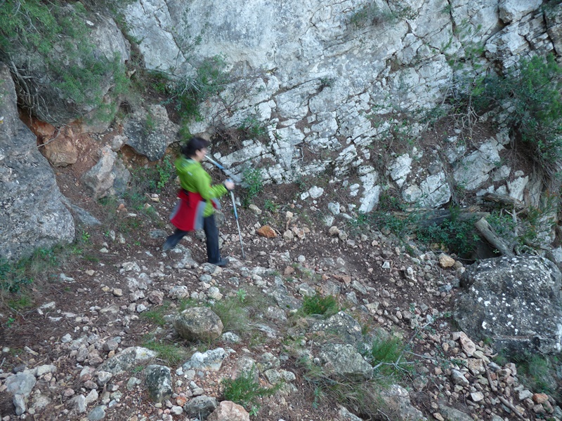 El camí ràpidament guanya alçada primer per una tartera per endinsar-se ben aviat enmig de les parets dels cingles de la muntanya de Montalt. El camí és molt dret i relliscós si està humit. Sovint haurem d’ajudar-nos de la vegetació i les mans per pujar, tot i que sense cap dificultat remarcable.