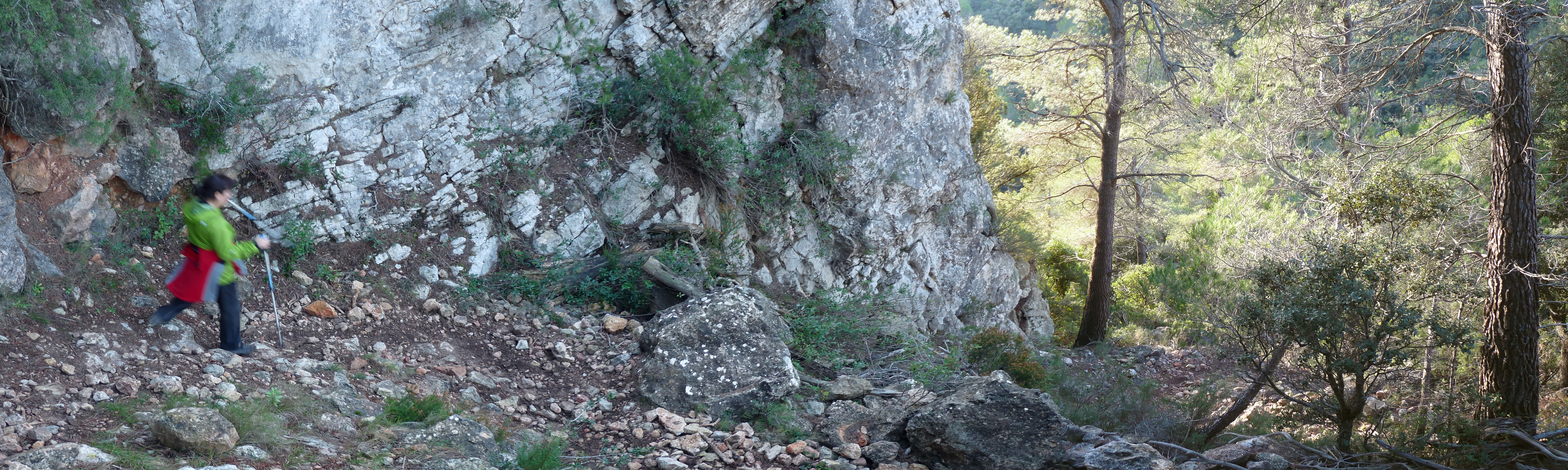 Un primer tram de pujada acaba en arribar sota el cingle del Montalt Sud. Entre una espessa garriga flanquejarem sota el cingle cap a l’esquerra per un sender de vegades no gaire evident en direcció nord. Des d’aquest tram tindrem increïbles vistes del pantà de Guiamets, de Lo Tormo i de la Serra de Montsant en un marc rocós incomparable.