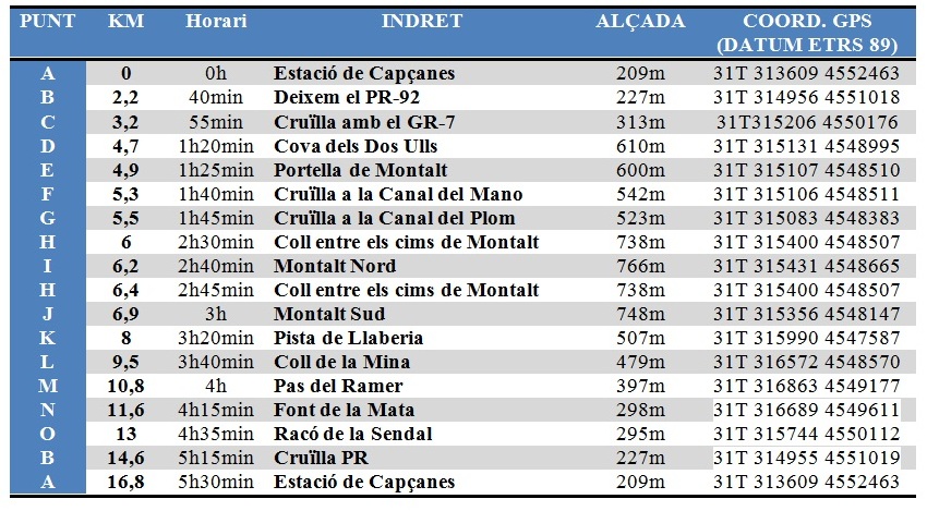 16,8 km 5h30min Estació de Capçanes (209 m) (gps 31T 313609 4552463)