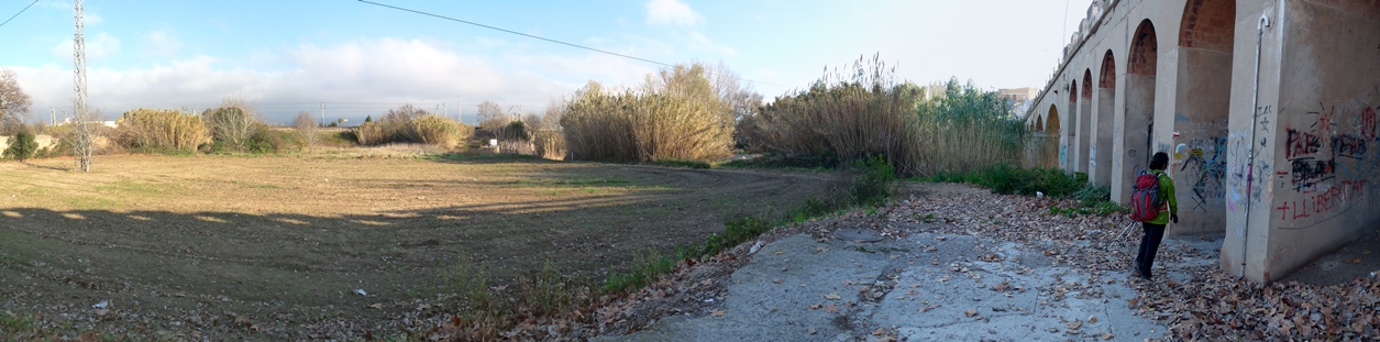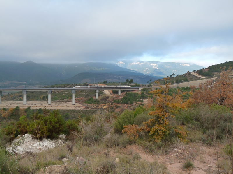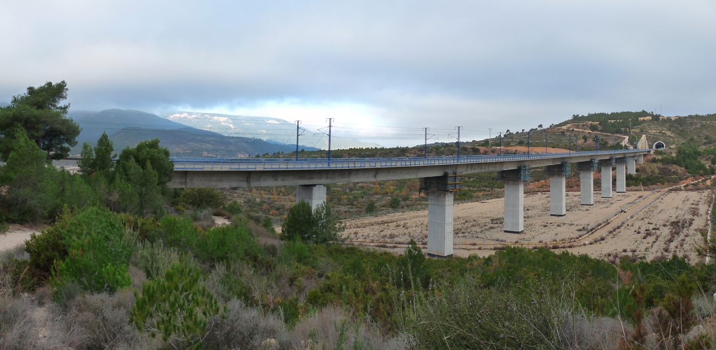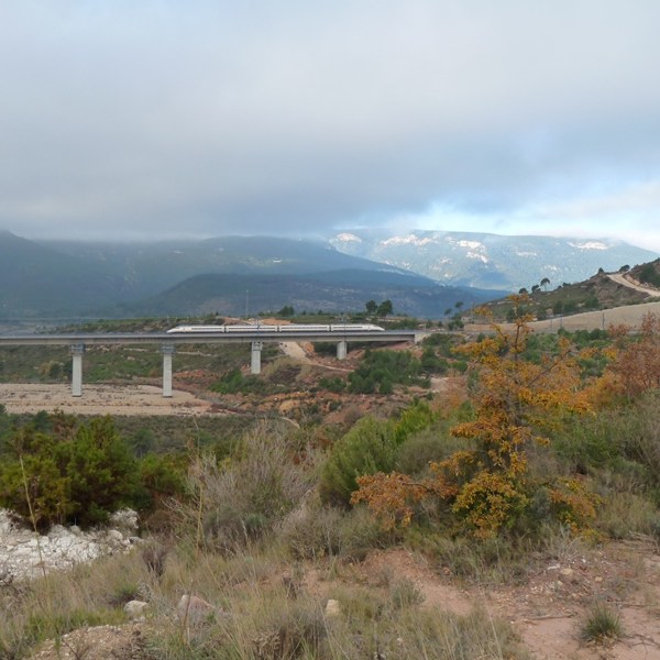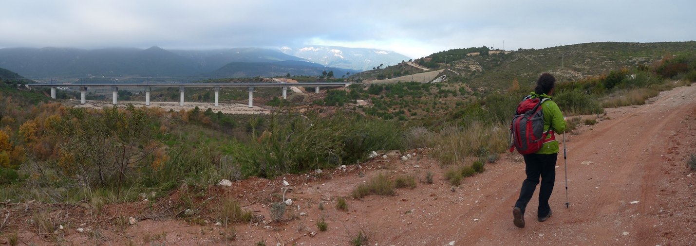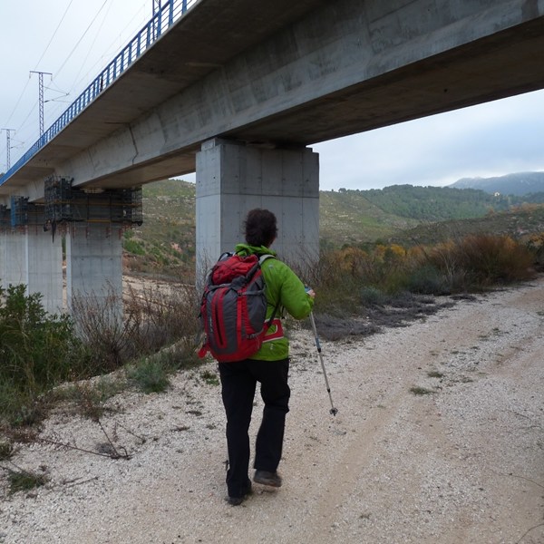 Creuem el viaducte elevat de la via del tren d’alta velocitat, des d’on el camí guanya alçada ràpidament. Si tenim sort que en aquell moment passi un tren, obtindrem una bona panoràmica del pont amb la Serra de Prades com a teló de fons.