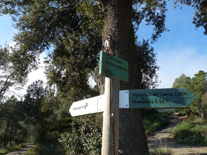 Gran exemplar d’alzina situada a mà esquerra del camí. Trobem un pal indicador de fusta que ens informa del nom i alçada de l’indret. Seguim per la pista en direcció a Prenafeta (56min). Al cap de 450m de caminar per la pista trobem una cruïlla on abandonem el PR C-5.1, que baixa cap a Valls. En arribar a la cruïlla del camí que puja de Figuerola del Camp (senyalitzada amb un pal indicador), seguim la pista ara en pujada i amb vistes a la Serra Carbonària fins al coll de Prenafeta.